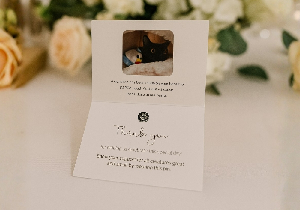 Make your wedding day even more memorable by supporting RSPCA South Australia. With a heartfelt contribution, you’ll receive customised wedding favours that reflect your commitment to animal welfare and show your guests what truly matters to you.